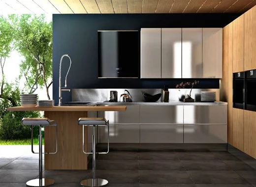 Modern kitchen with dark blue wall, white cabinets, wooden accents, and a view of greenery outside.